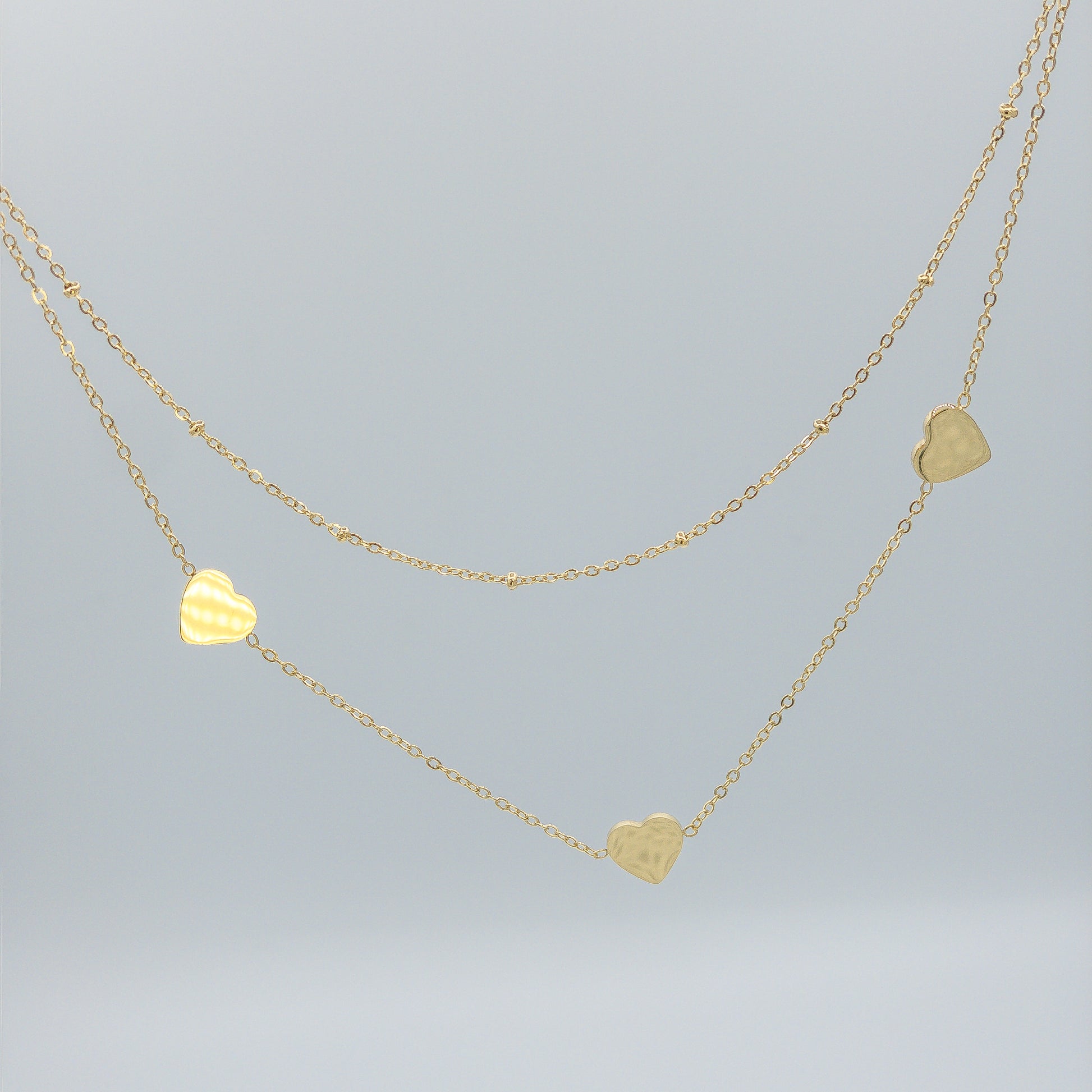 Design: Double-layer chain with 3 solid gold heart charms.