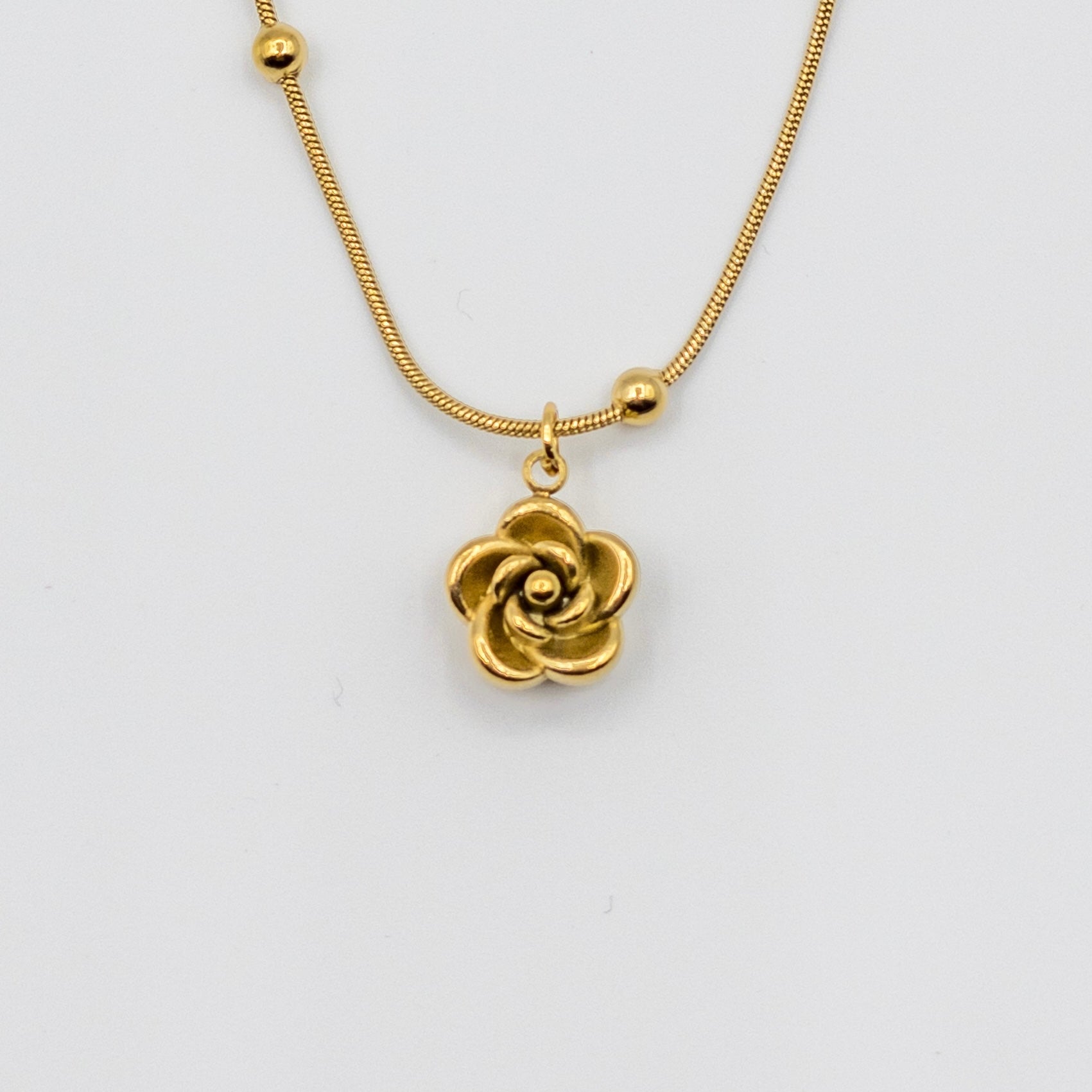 Design: Round Snake Chain with Gold Beads & Rose Charm.