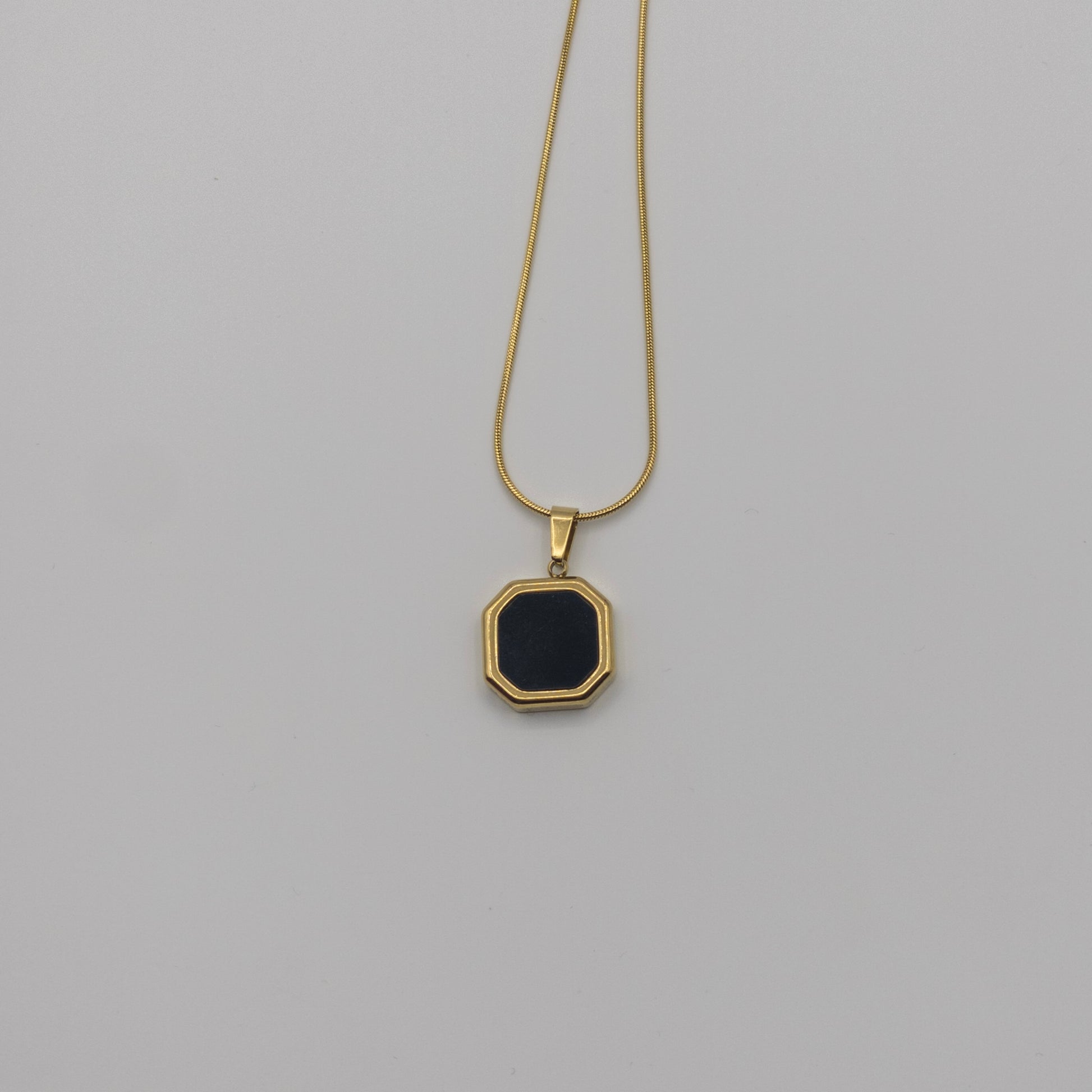 This is the "Midnight" edition of our best-selling vintage octagon necklace. It features a deep black stone (simulated Onyx) set in a polished golden octagon frame.