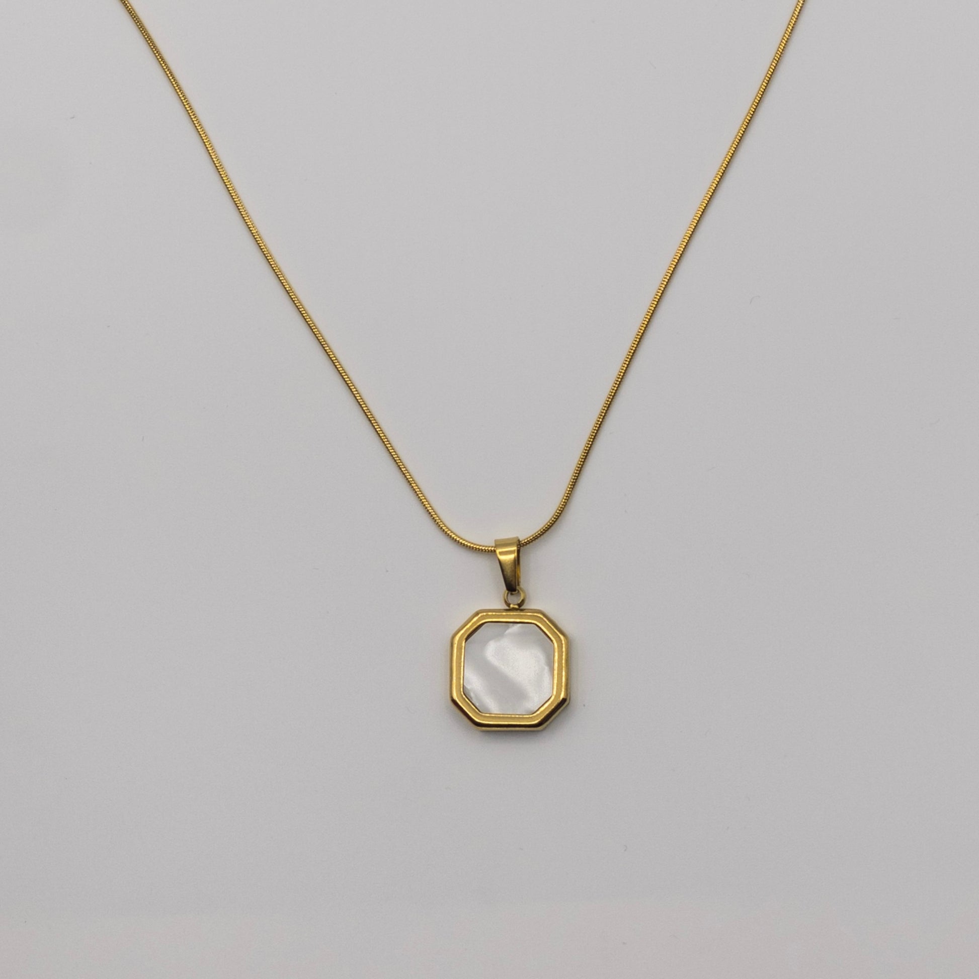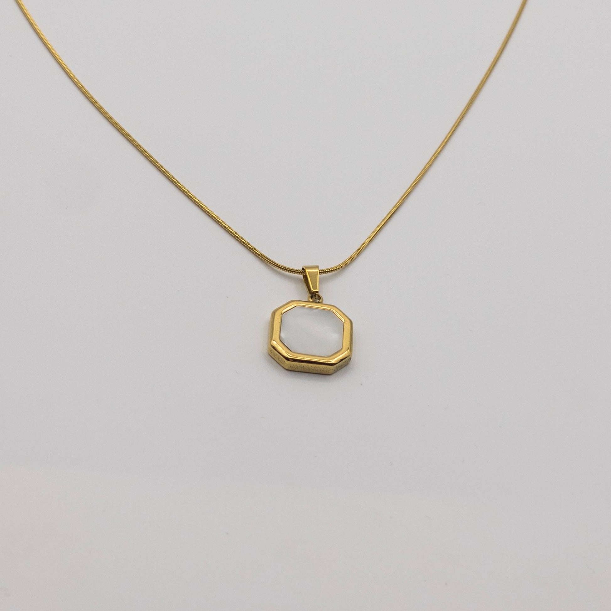 This necklace channels the "Old Money" aesthetic perfectly. It features a lustrous white pendant (simulated Mother of Pearl) cut in a classic octagon shape and framed in polished gold.